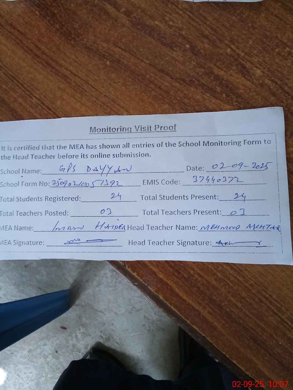 | Attendance Register | Head Teacher | MEA with School | Visit Proof |