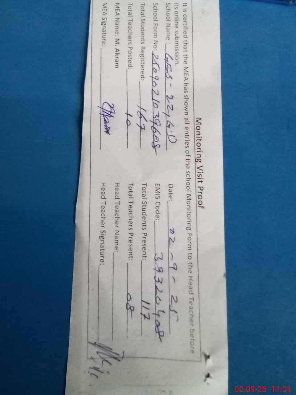 | Attendance Register | Head Teacher | MEA with School | Visit Proof |