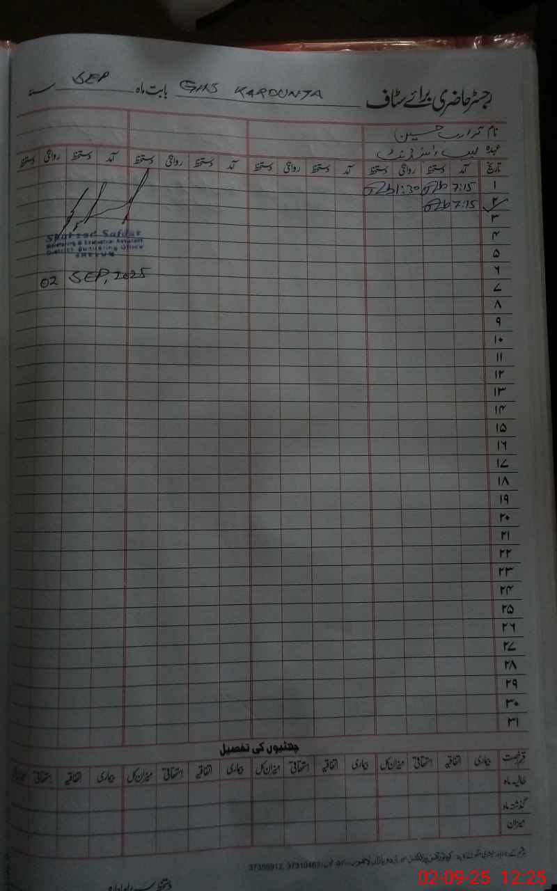 | CNIC | Full Name | Designation | R/C | Absence During Last Calender Month |