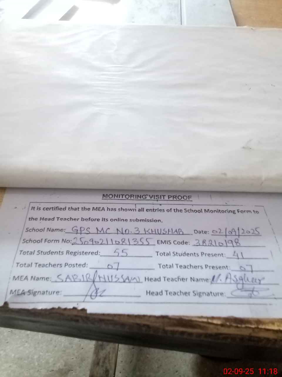 | Attendance Register | Head Teacher | MEA with School | Visit Proof |