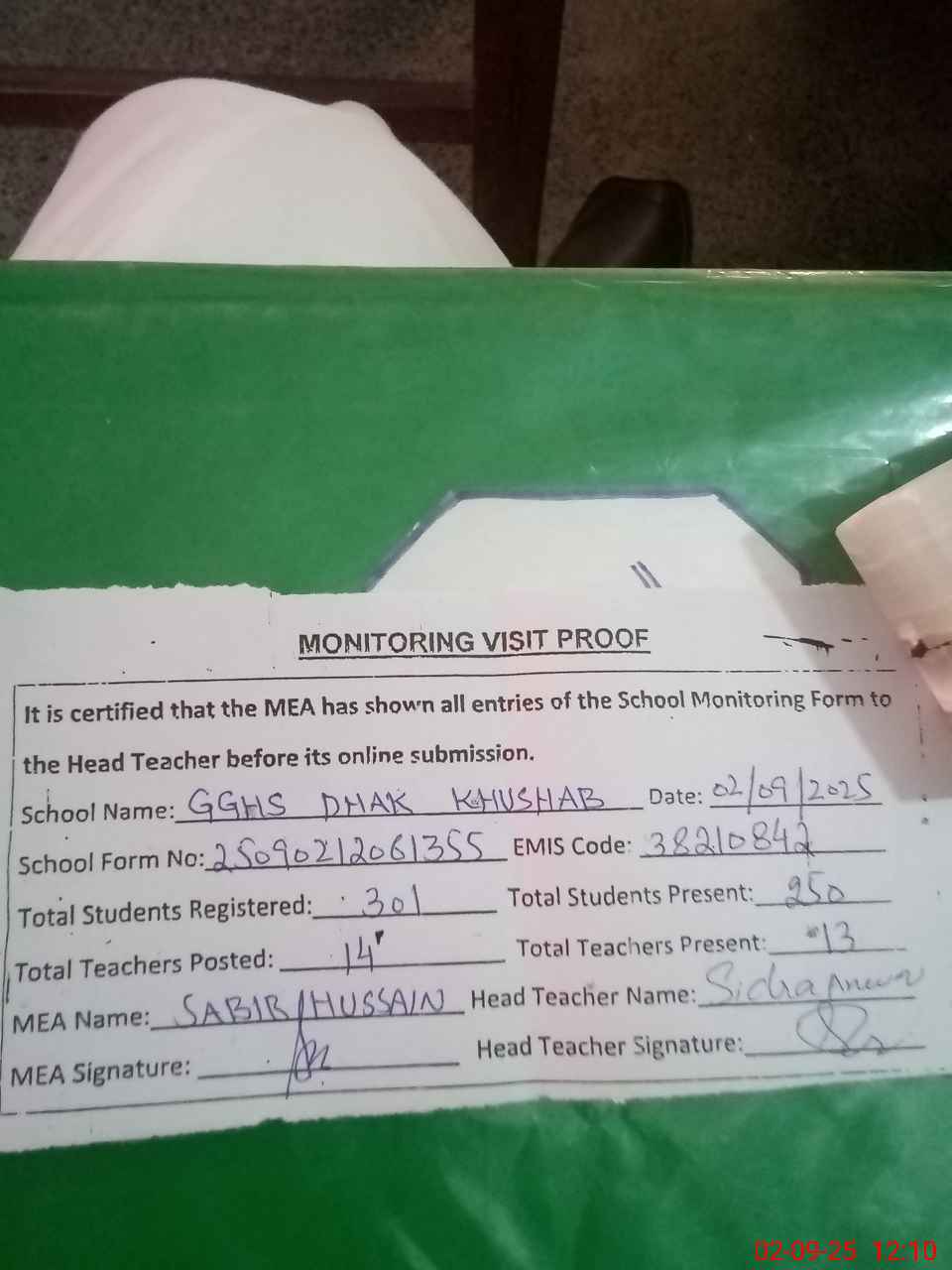 | Attendance Register | Head Teacher | MEA with School | Visit Proof |