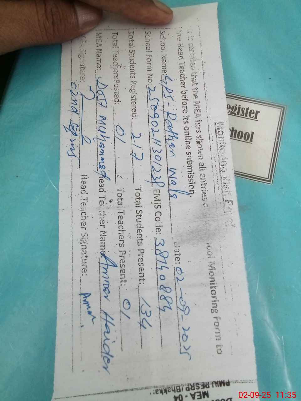 | Attendance Register | Head Teacher | MEA with School | Visit Proof |