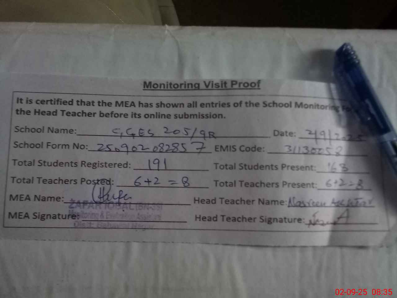| EMIS Code: 31130058 | Name of School: GGES CHAK 205/9-R | |||