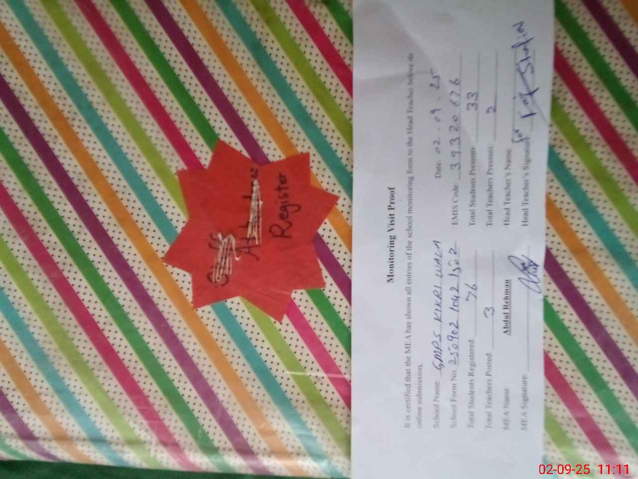 | Attendance Register | Head Teacher | MEA with School | Visit Proof |
