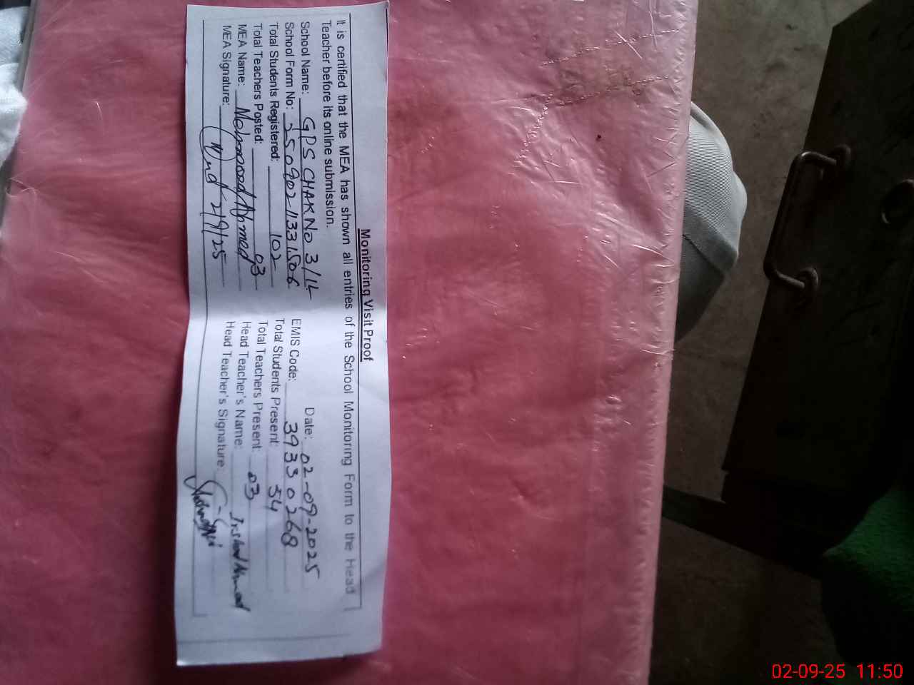 | Attendance Register | Head Teacher | MEA with School | Visit Proof |