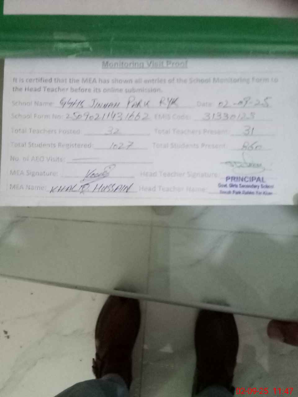 | Attendance Register | Head Teacher | MEA with School | Visit Proof |