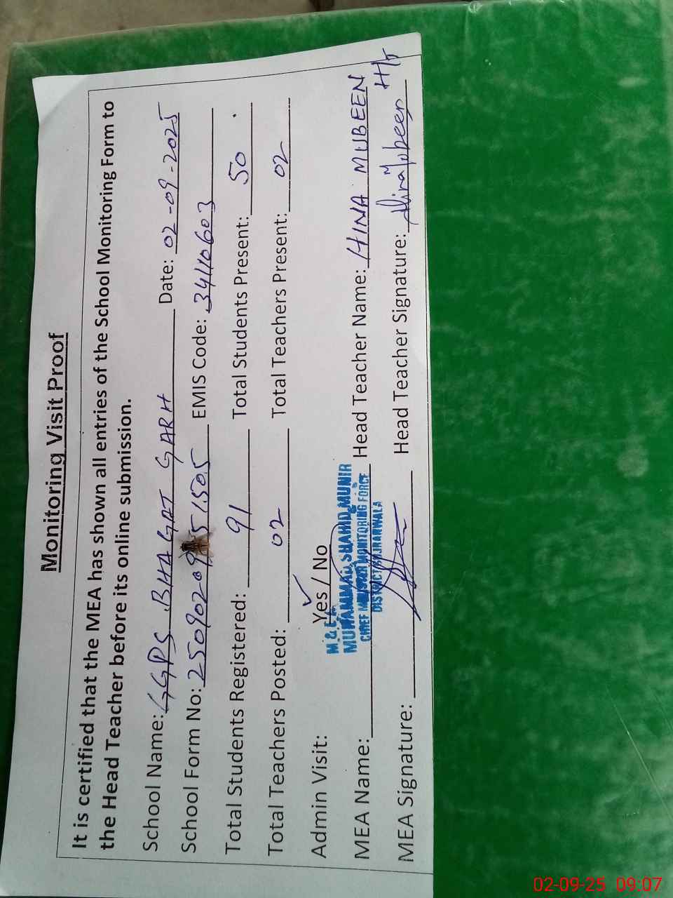 | Certified that this School was Inspected by the Undersigned MEA/DMO Today and the Information Stated Above is as Per Record. | |||||