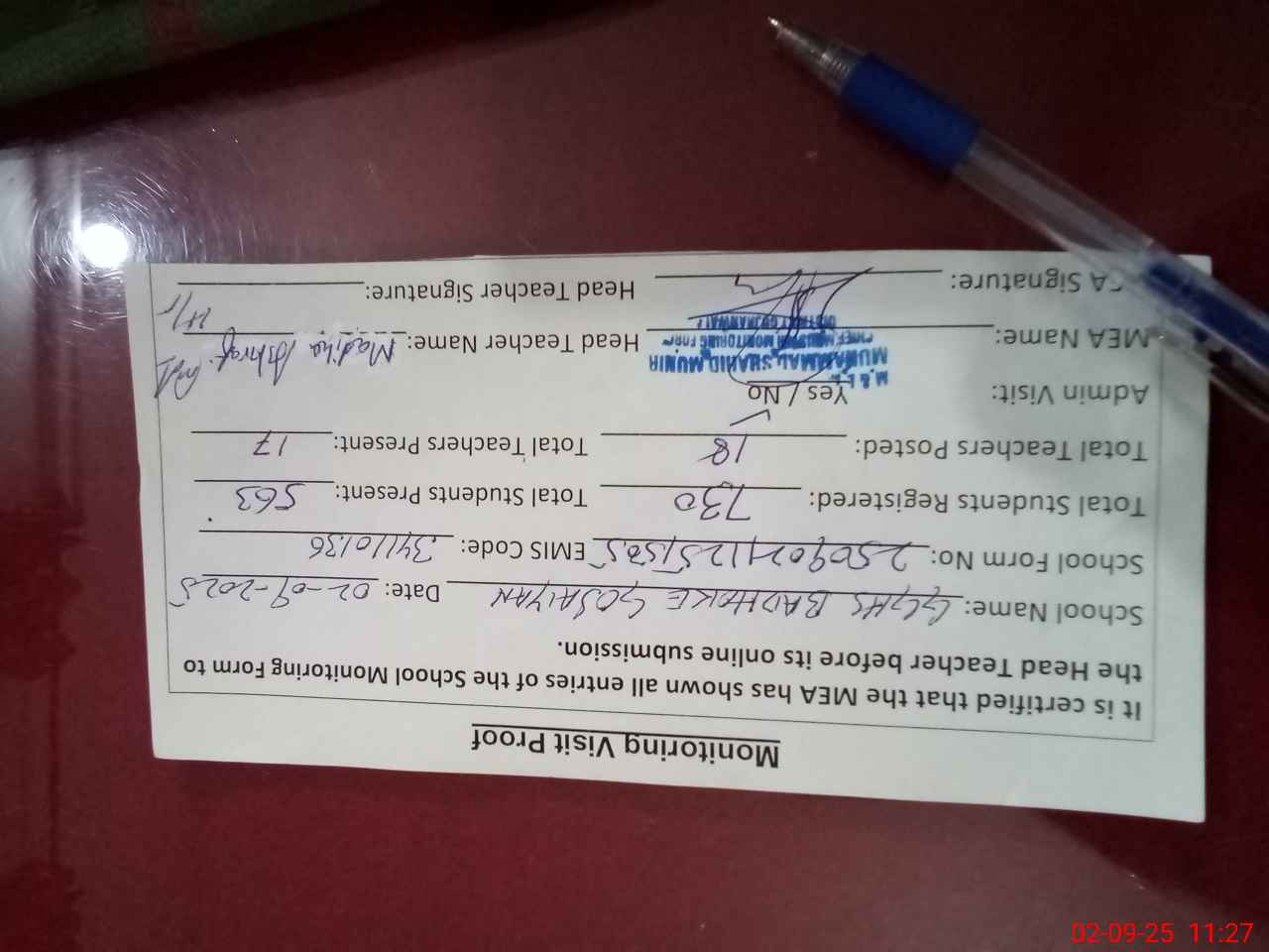 | Attendance Register | Head Teacher | MEA with School | Visit Proof |