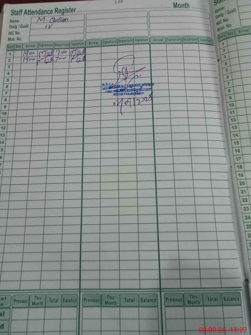 | CNIC | Full Name | Designation | R/C | Absence During Last Calender Month |
