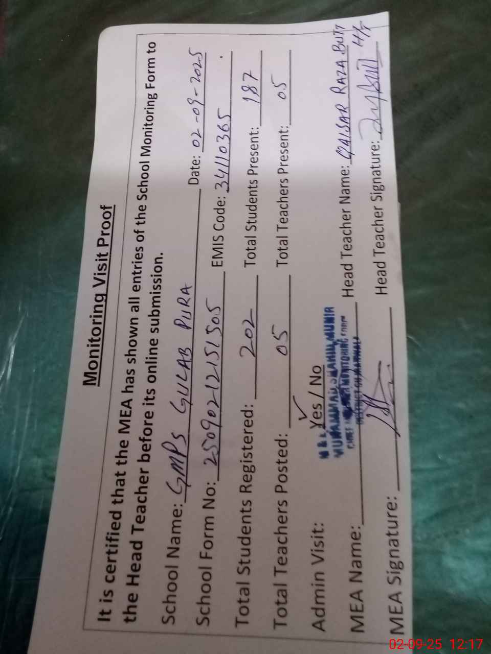 | EMIS Code: 34110365 | Name of School: GMPS GULAB PURA | |||
