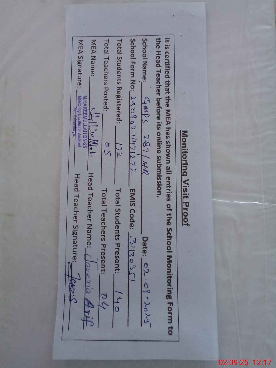 | Attendance Register | Head Teacher | MEA with School | Visit Proof |