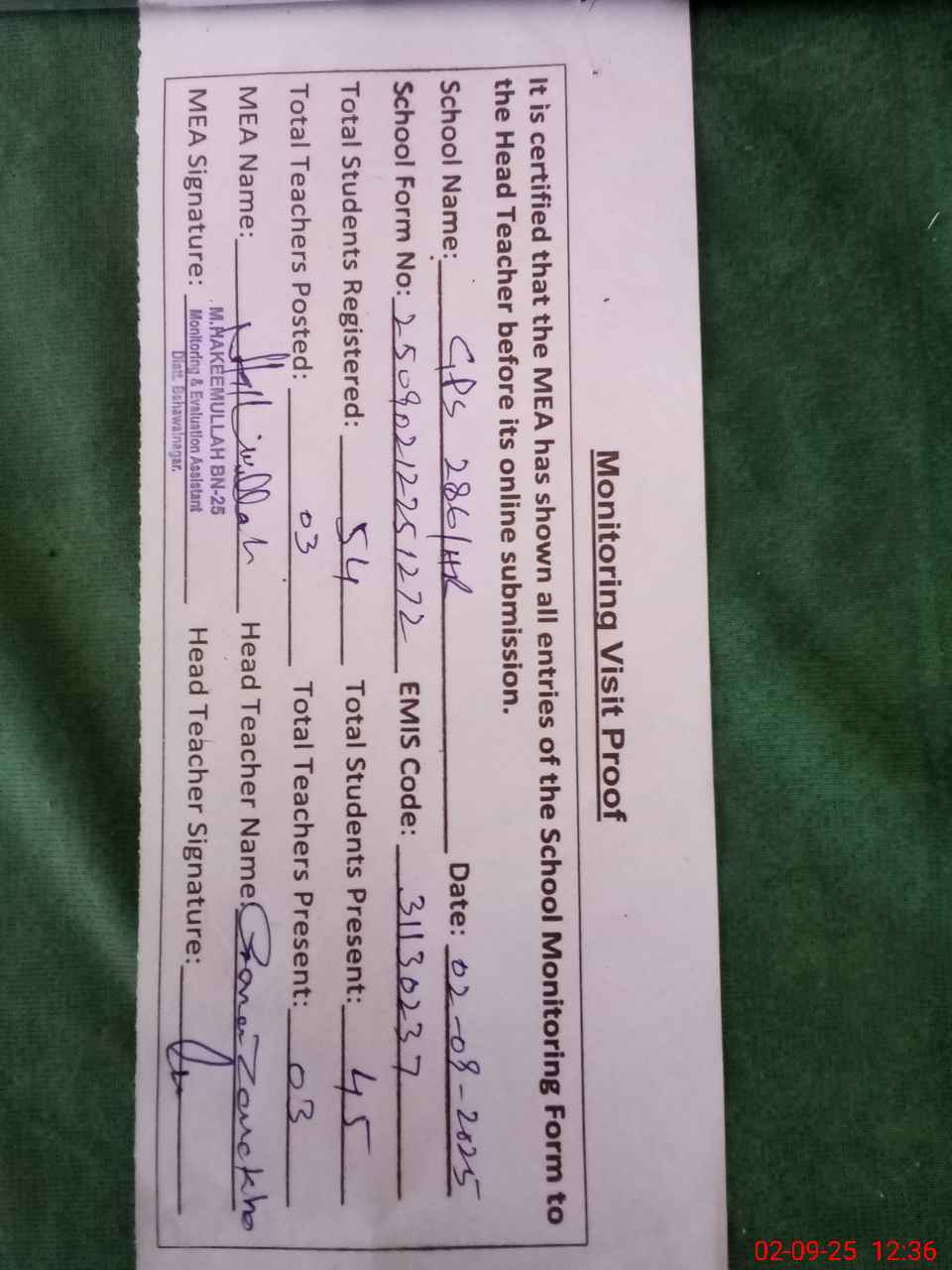 | Attendance Register | Head Teacher | MEA with School | Visit Proof |