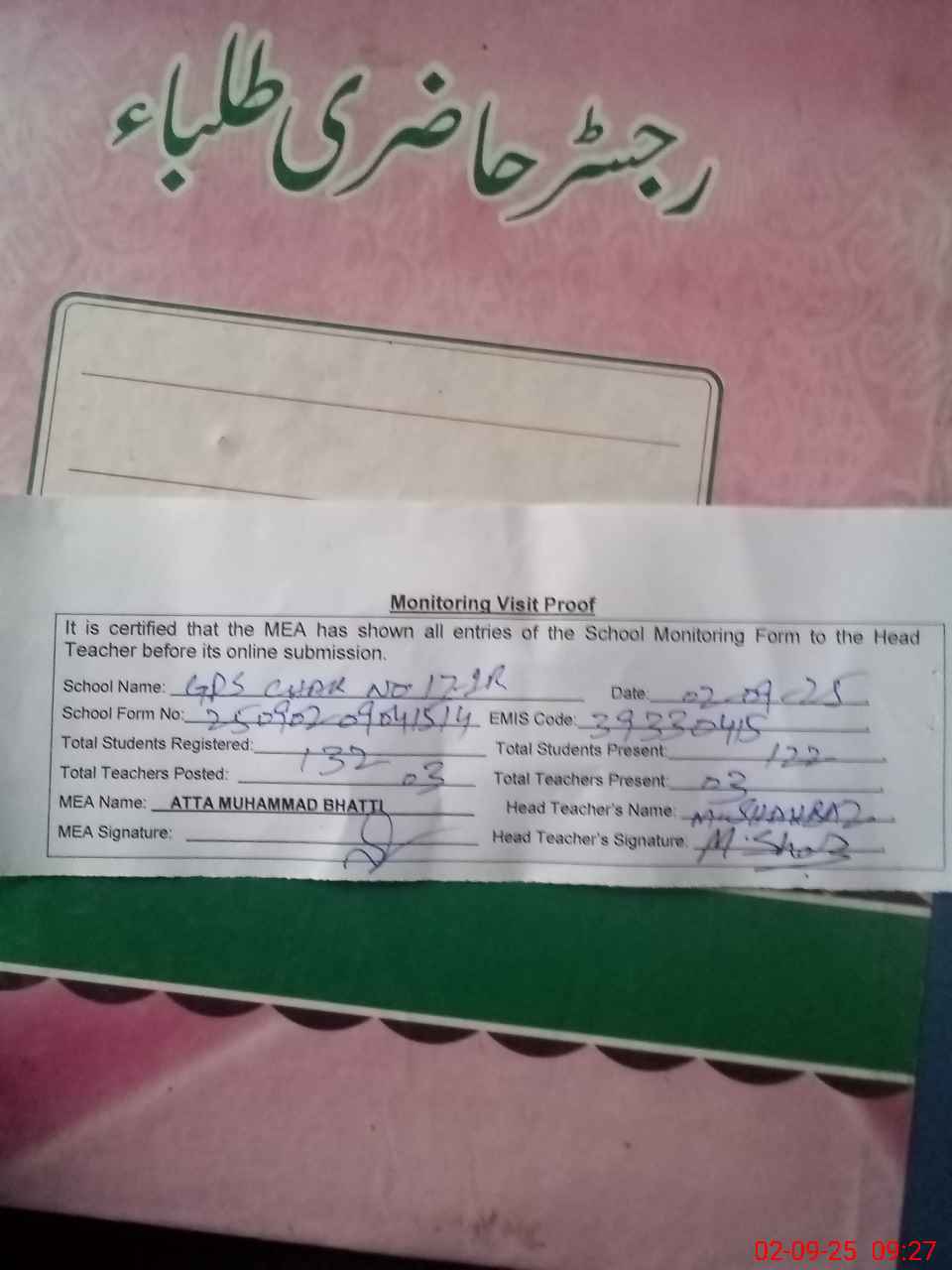 | Attendance Register | Head Teacher | MEA with School | Visit Proof |