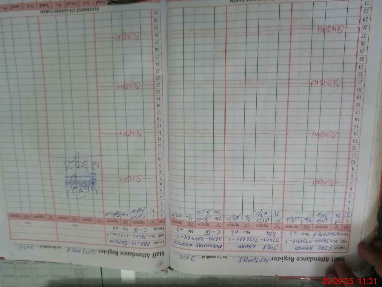 | CNIC | Full Name | Designation | R/C | Absence During Last Calender Month |