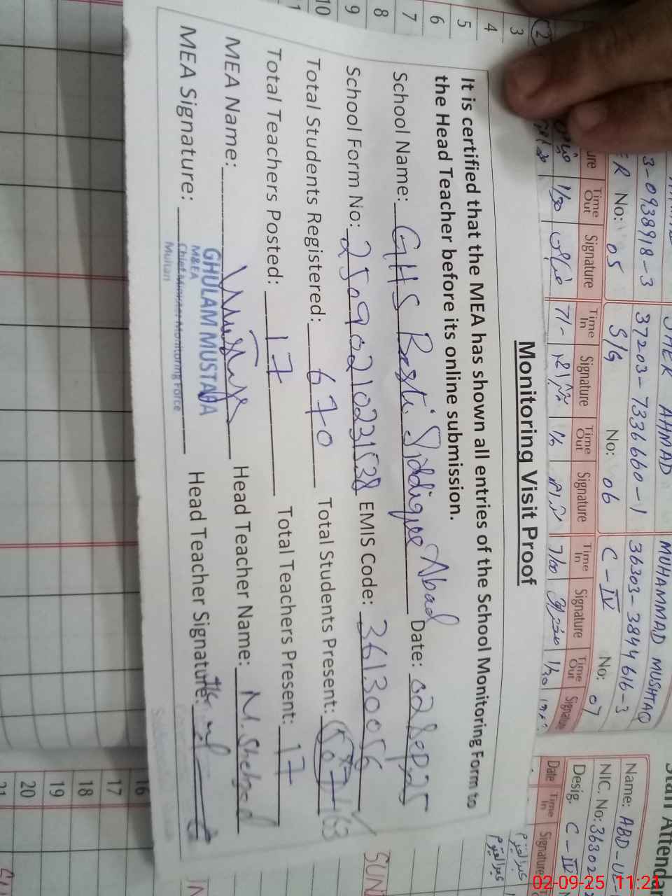 | Attendance Register | Head Teacher | MEA with School | Visit Proof |