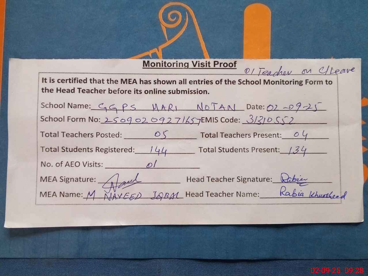 | Attendance Register | Head Teacher | MEA with School | Visit Proof |