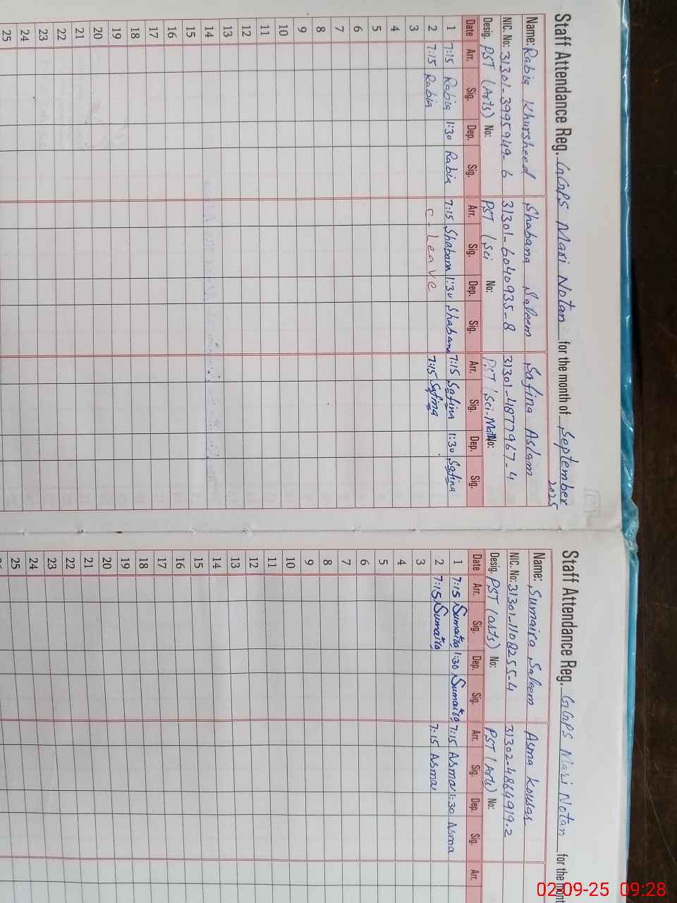 | CNIC | Full Name | Designation | R/C | Absence during last cal. month |