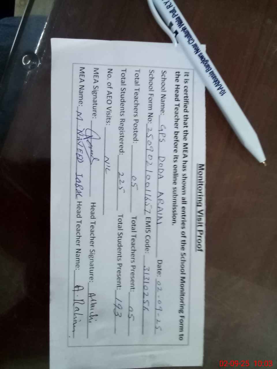 | Attendance Register | Head Teacher | MEA with School | Visit Proof |