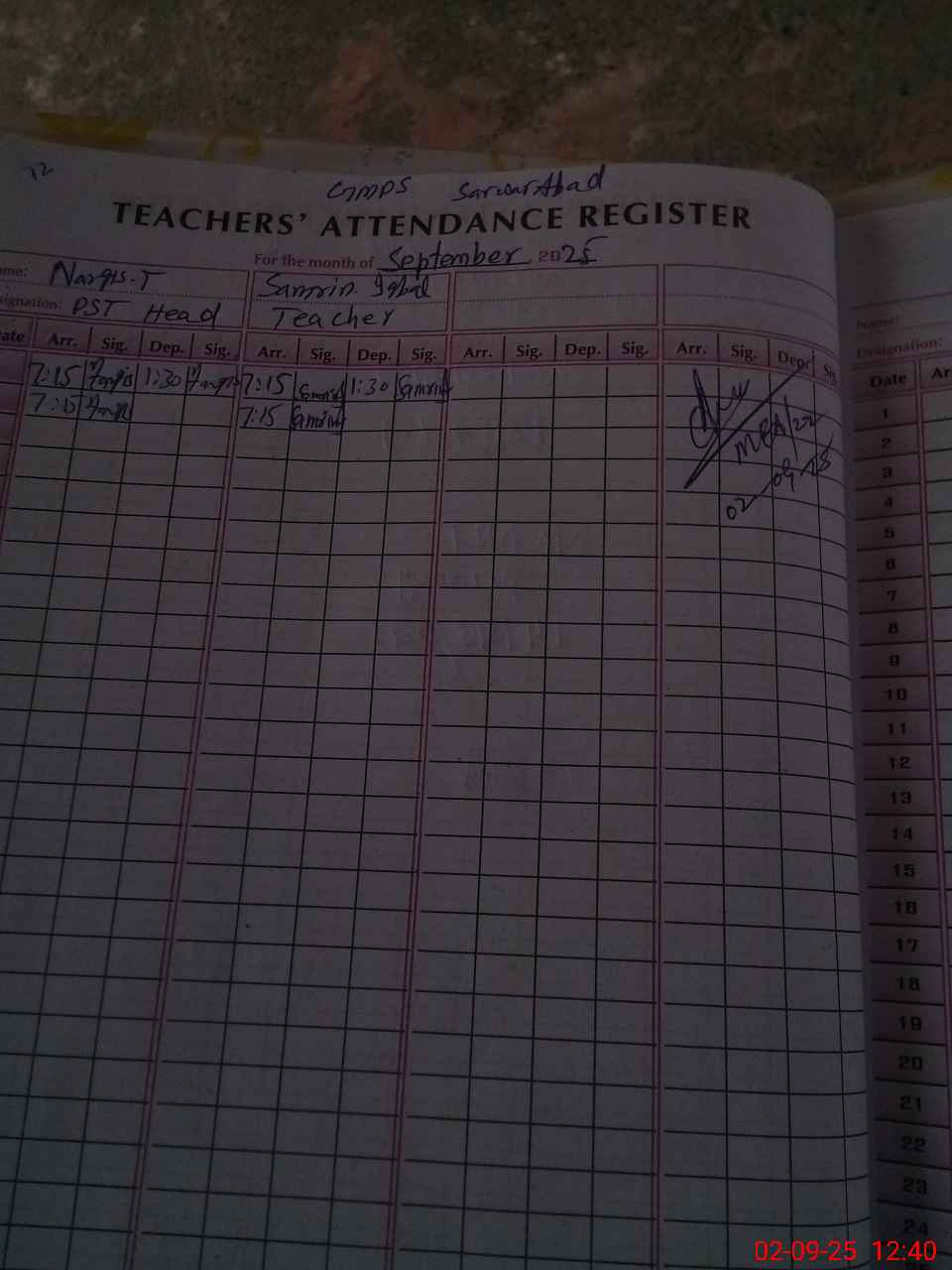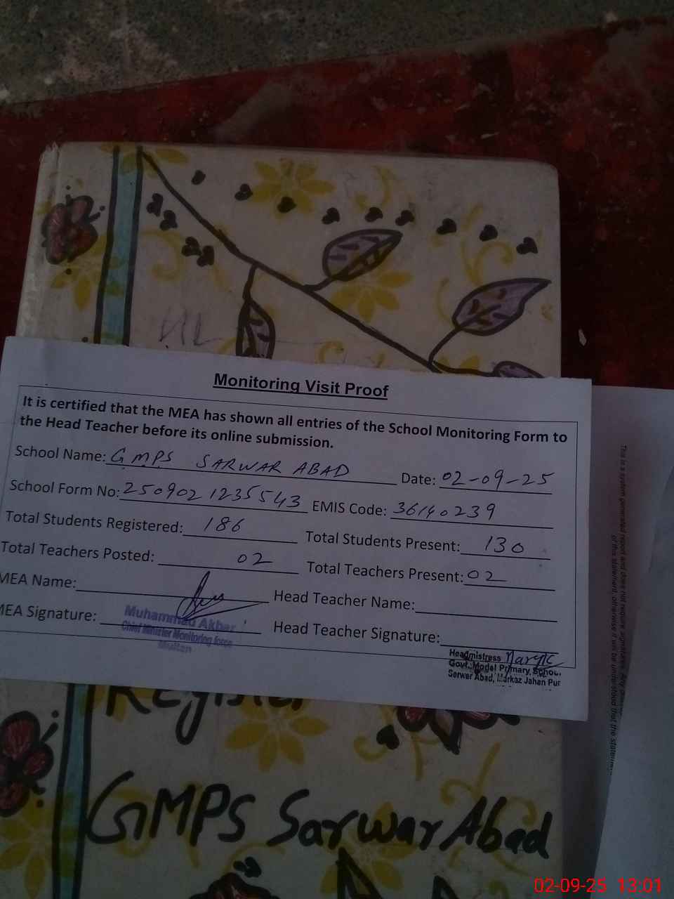 | Attendance Register | Head Teacher | MEA with School | Visit Proof |