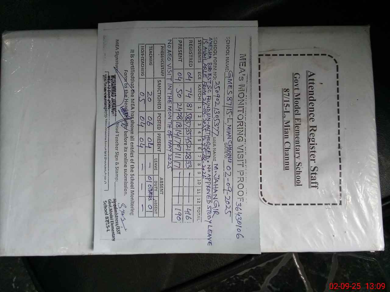 | Attendance Register | Head Teacher | MEA with School | Visit Proof |