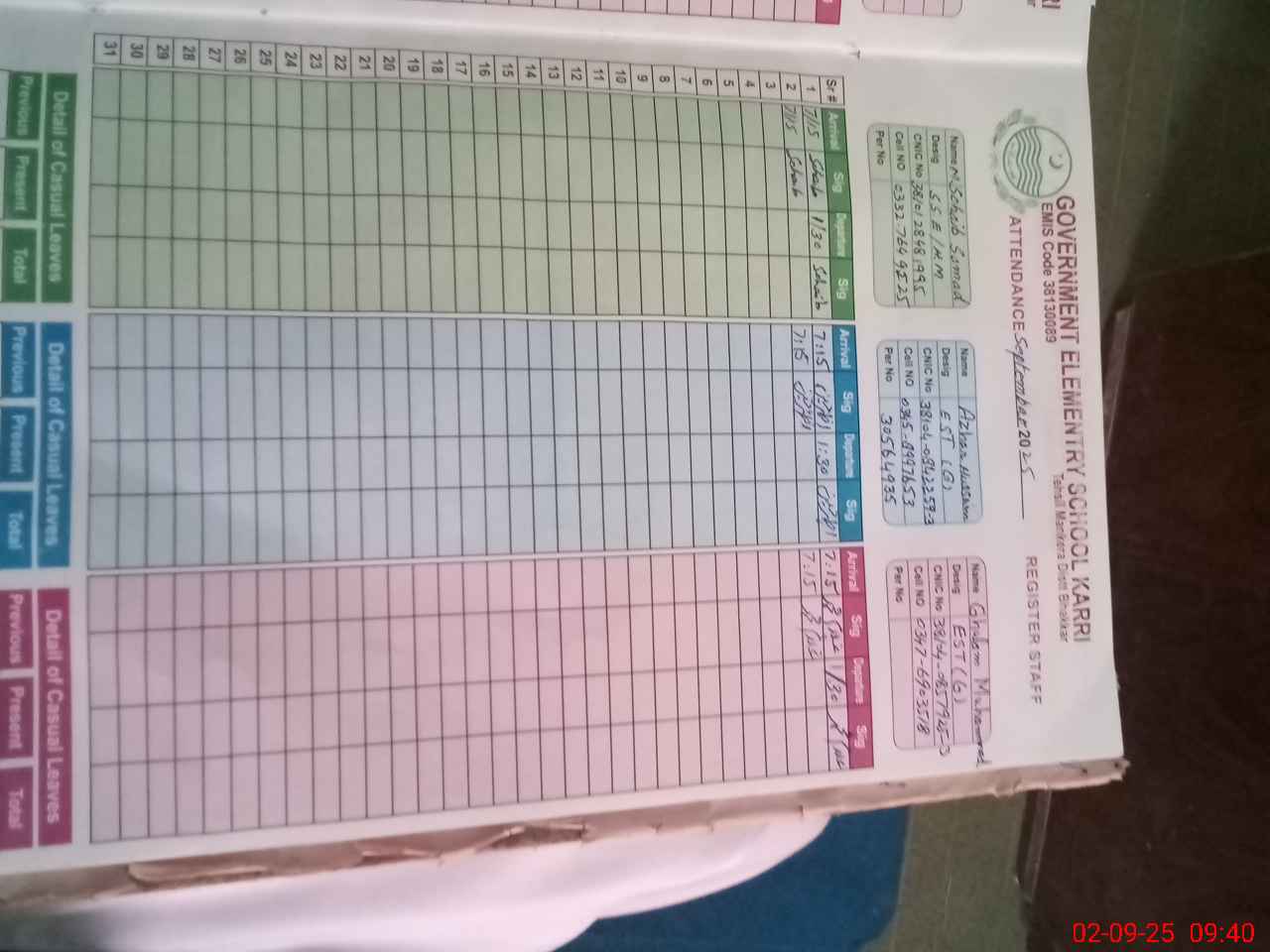 | CNIC | Full Name | Designation | R/C | Absence during last cal. month |