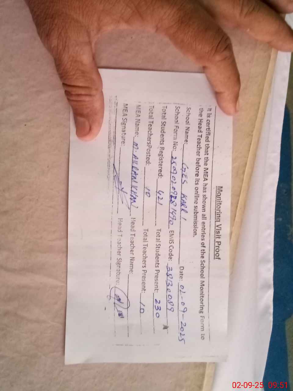 | Attendance Register | Head Teacher | MEA with School | Visit Proof |