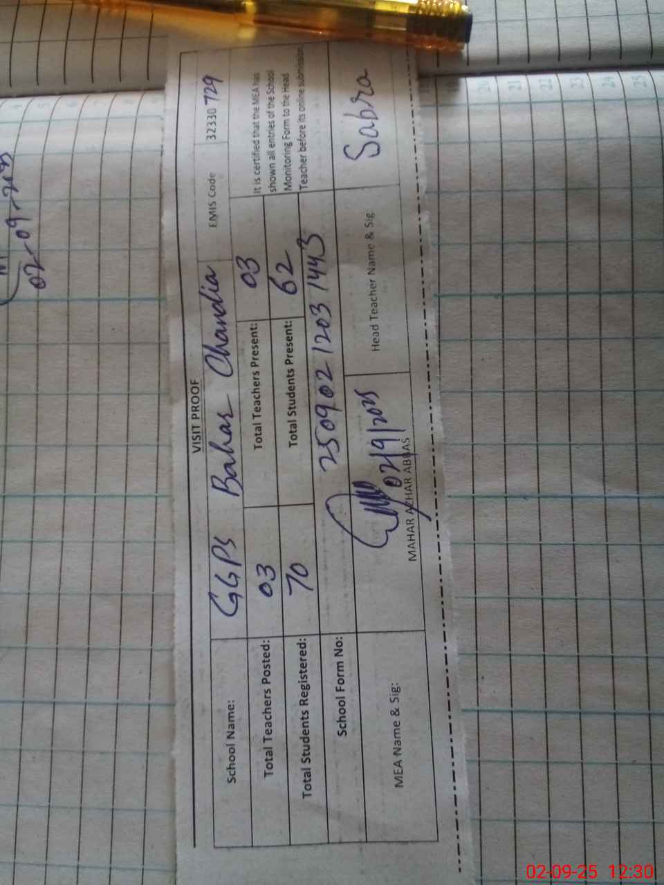 | EMIS Code: 32330729 | Name of School: GGPS BAHAR CHANDIA | |||