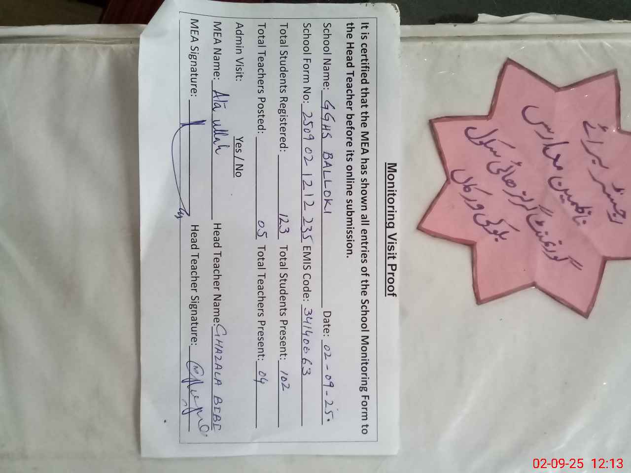 | Attendance Register | Head Teacher | MEA with School | Visit Proof |