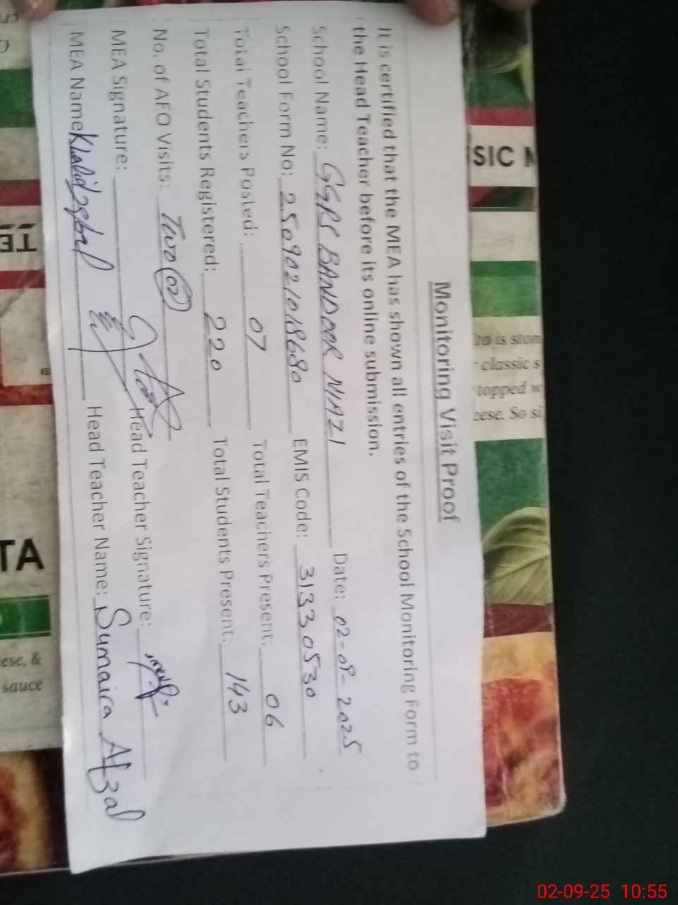 | Certified that this School was Inspected by the Undersigned MEA/DMO Today and the Information Stated Above is as Per Record. | |||||