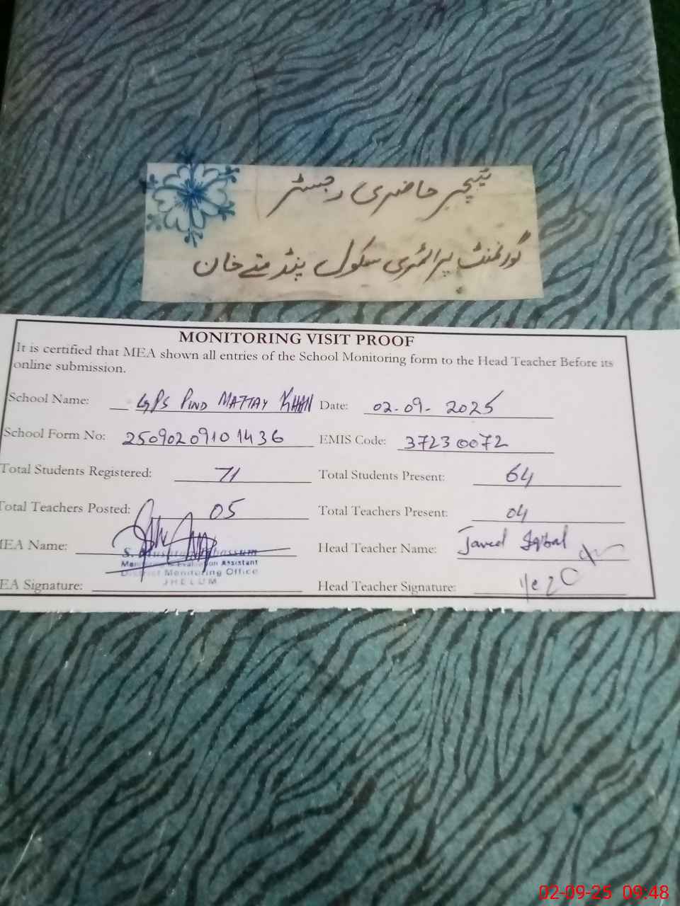 | EMIS Code: 37230072 | Name of School: GPS PIND MATTAY KHAN | |||