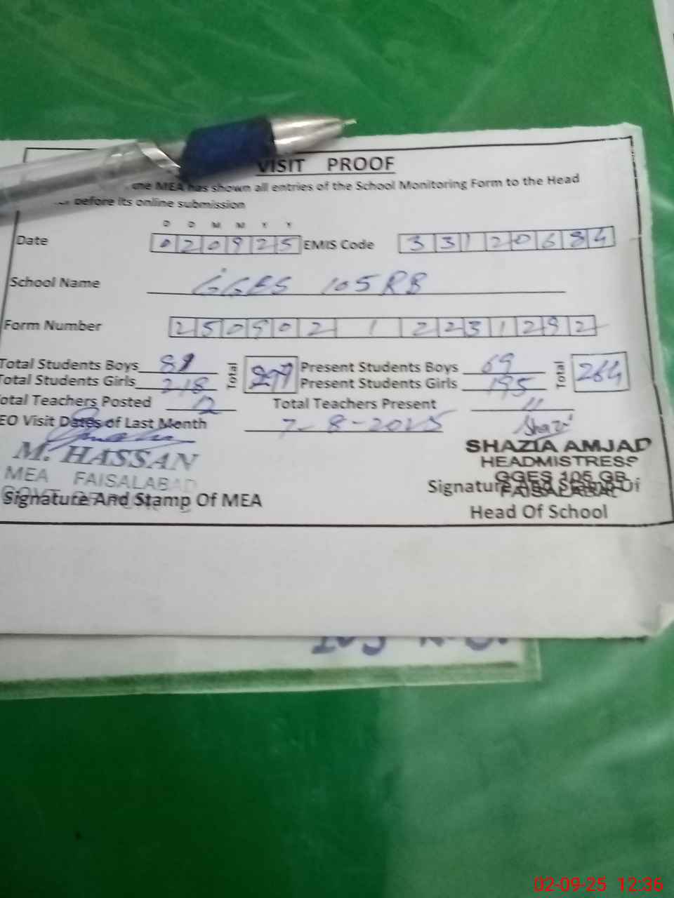 | Attendance Register | Head Teacher | MEA with School | Visit Proof |