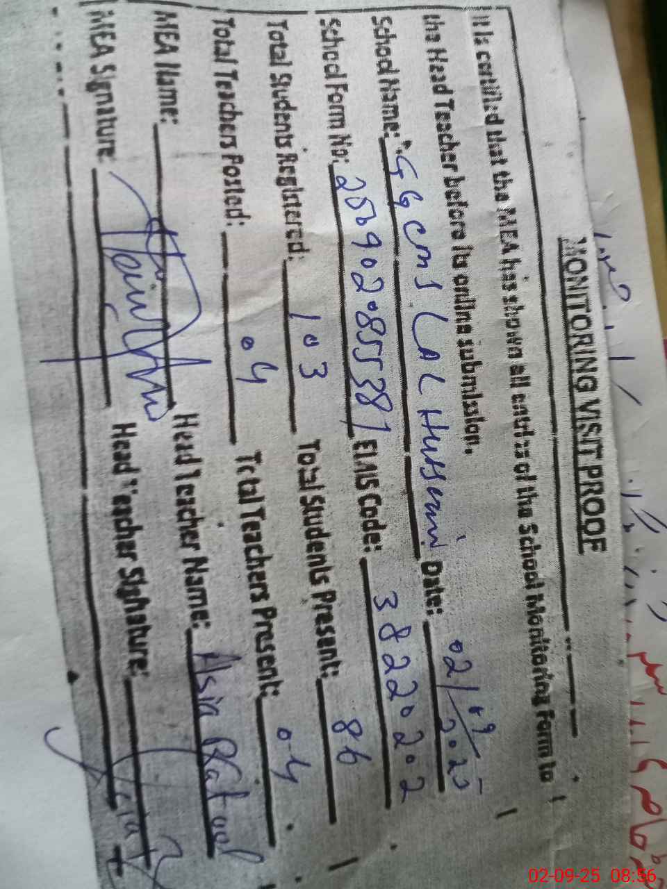 | Attendance Register | Head Teacher | MEA with School | Visit Proof |
