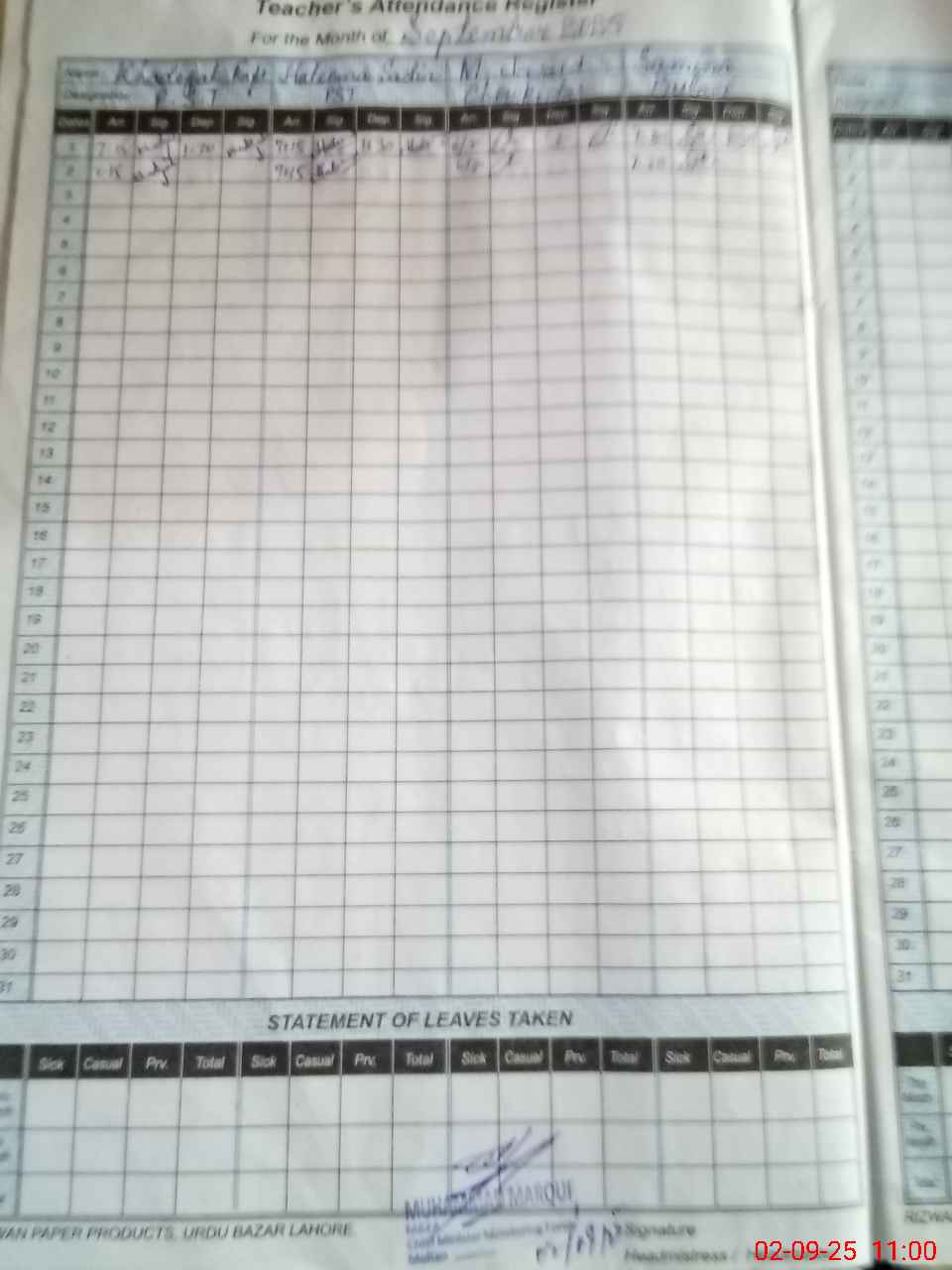 | CNIC | Full Name | Designation | R/C | Absence During Last Calender Month |