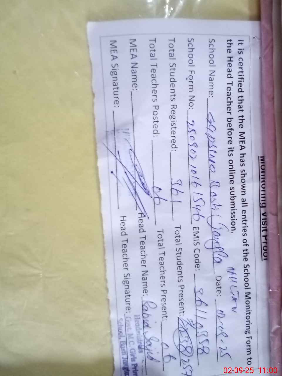 | Attendance Register | Head Teacher | MEA with School | Visit Proof |