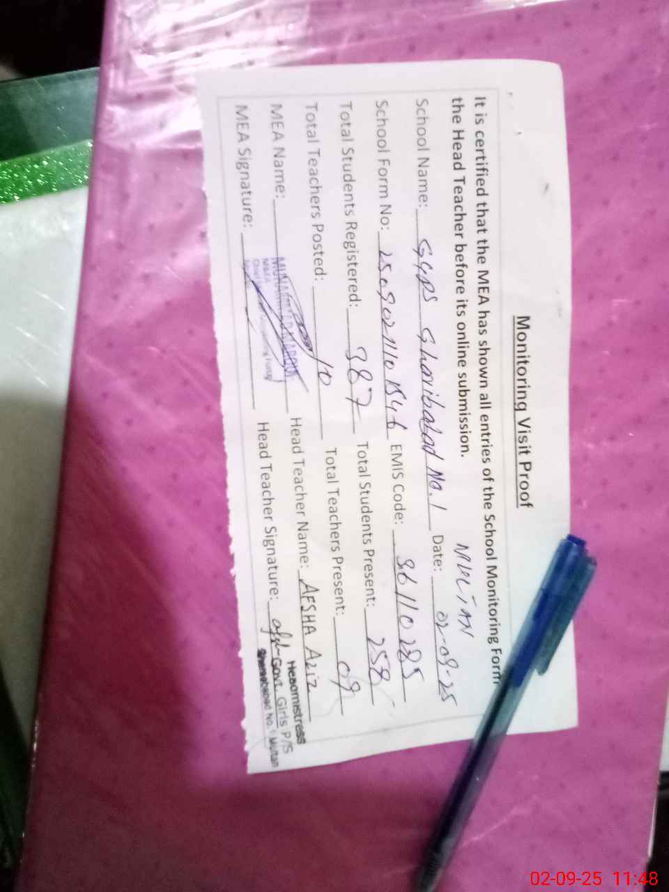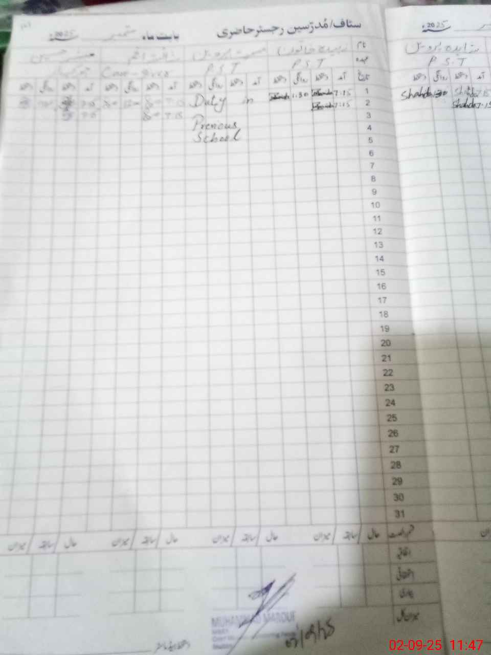 | Remarks (Use Separate Page if Required): PST musarat perveen had transferred in this school from out source school since 13Aug25 but physically performing duty in previous school marked on official duty This school have over strength but class rooms capacity less | |||||