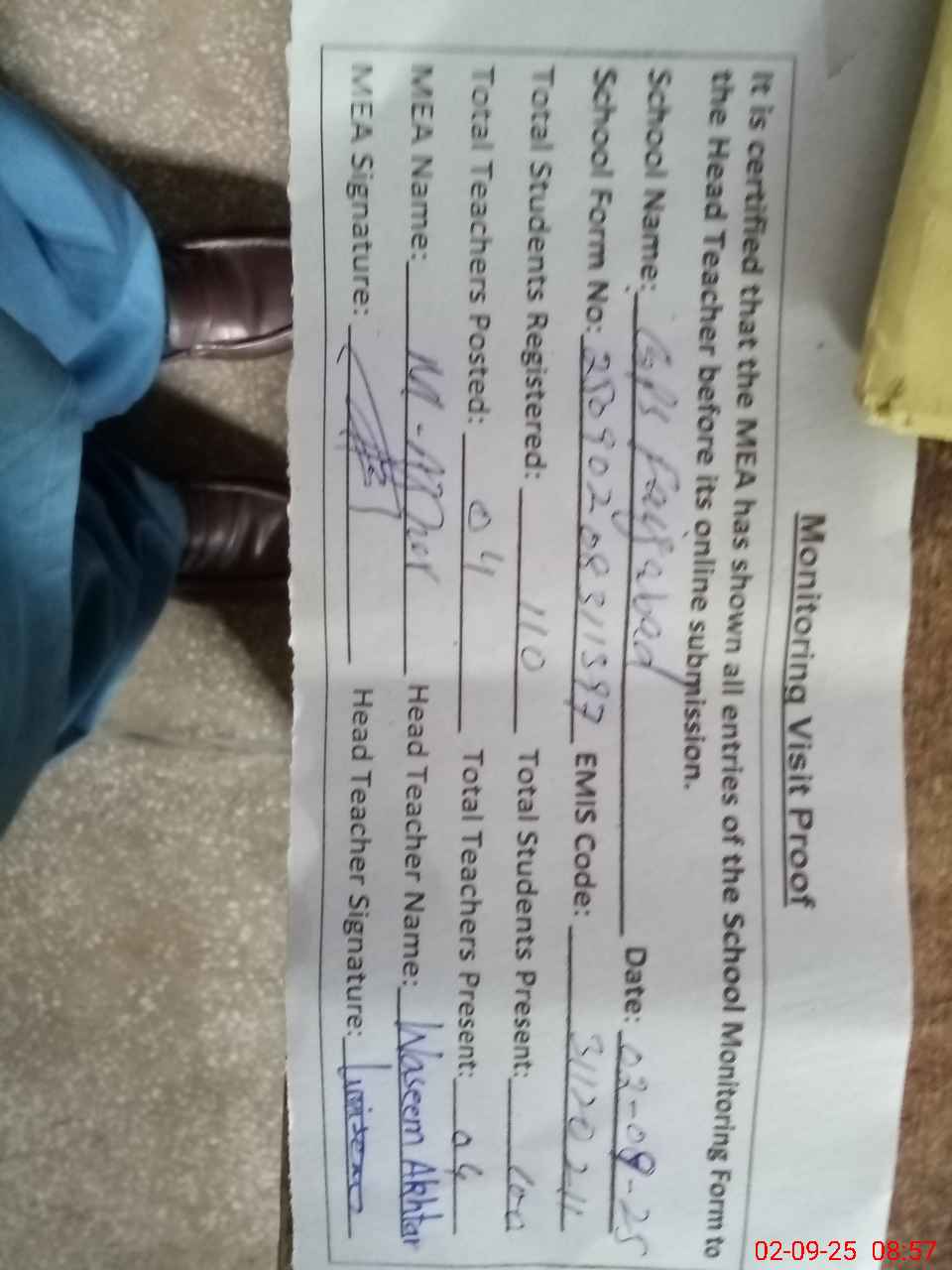 | Attendance Register | Head Teacher | MEA with School | Visit Proof |