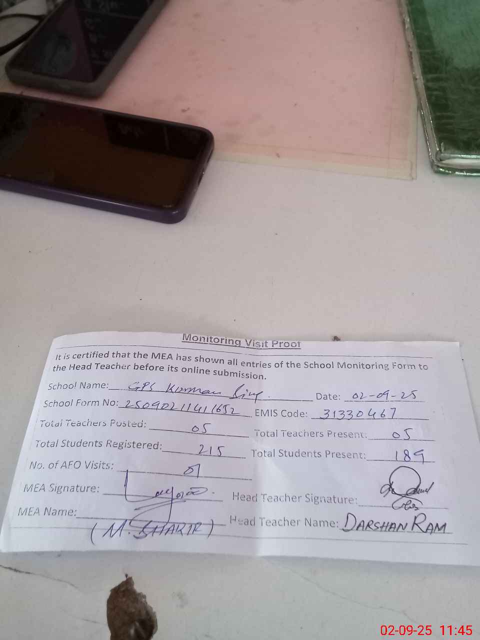 | EMIS Code: 31330467 | Name of School: GPS KURMAN SING | |||
