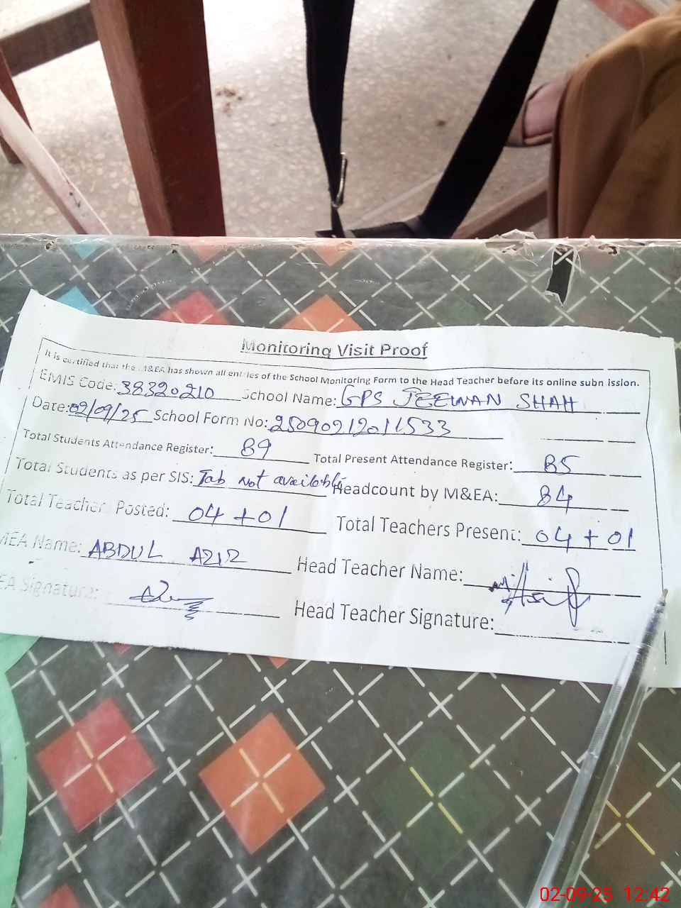 | Attendance Register | Head Teacher | MEA with School | Visit Proof |