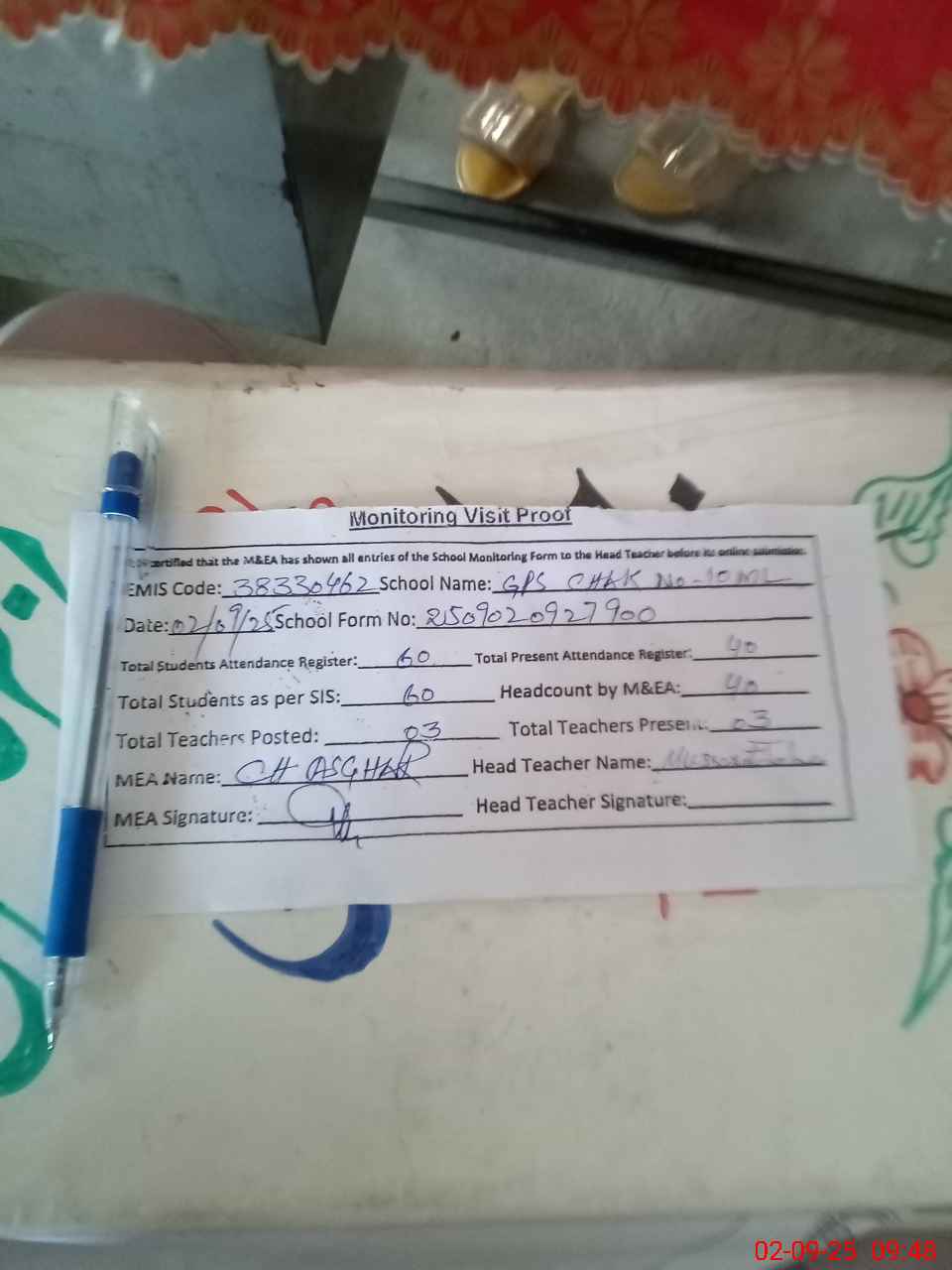 | EMIS Code: 38330462 | Name of School: GPS CHAK NO 10 ML | |||