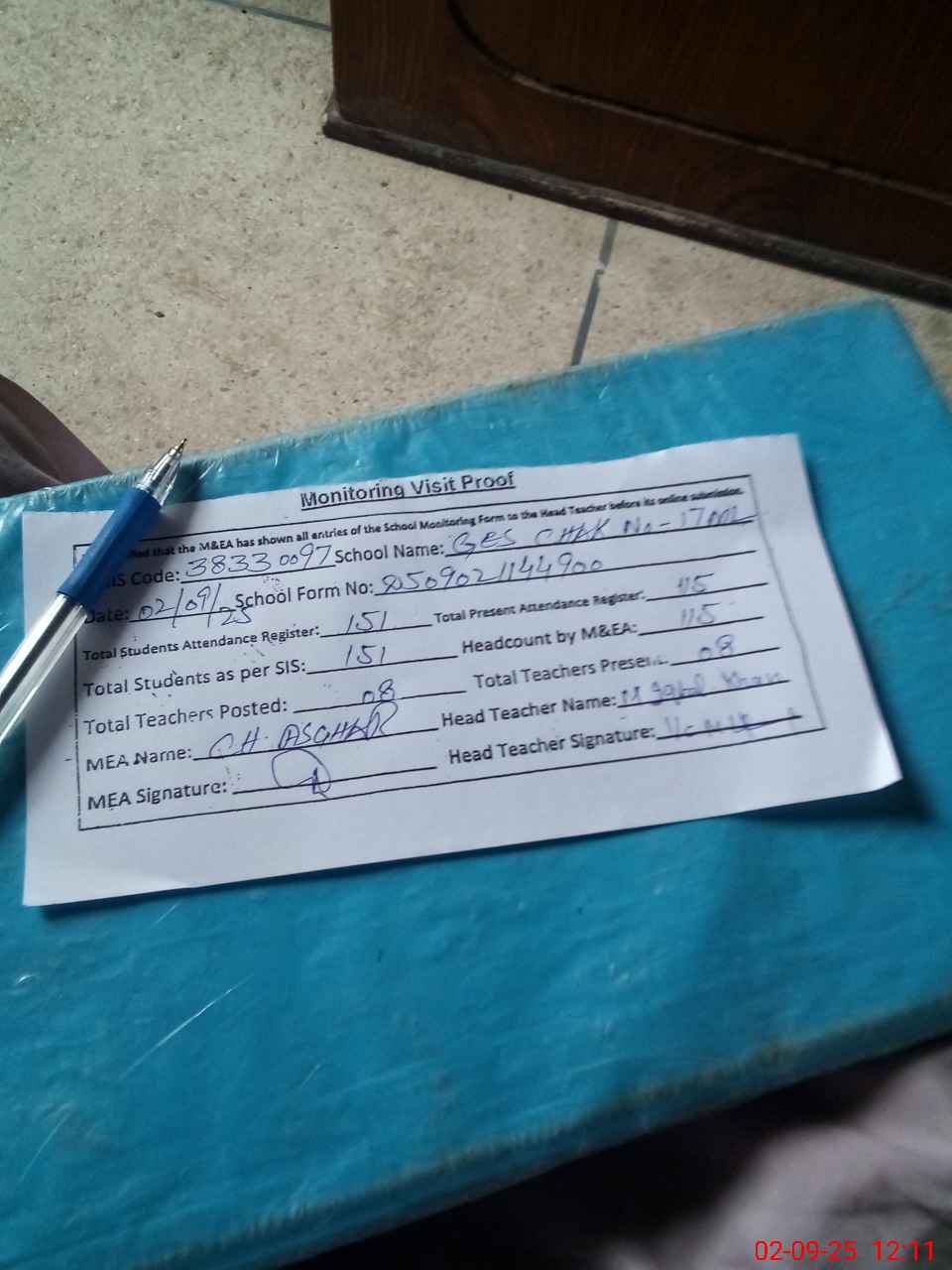 | Attendance Register | Head Teacher | MEA with School | Visit Proof |