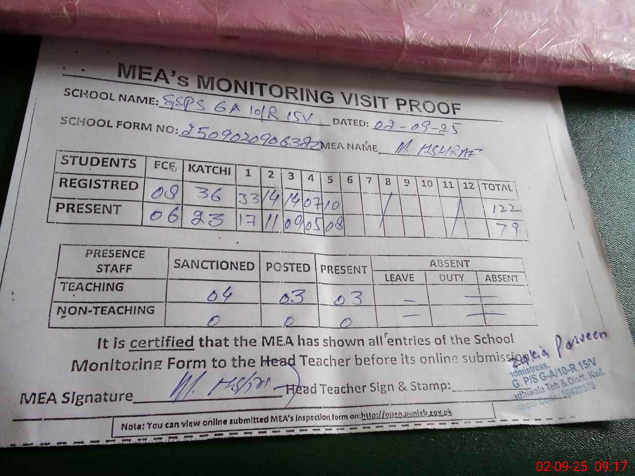 | Attendance Register | Head Teacher | MEA with School | Visit Proof |