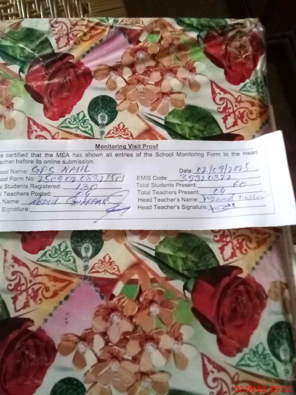 | Attendance Register | Head Teacher | MEA with School | Visit Proof |