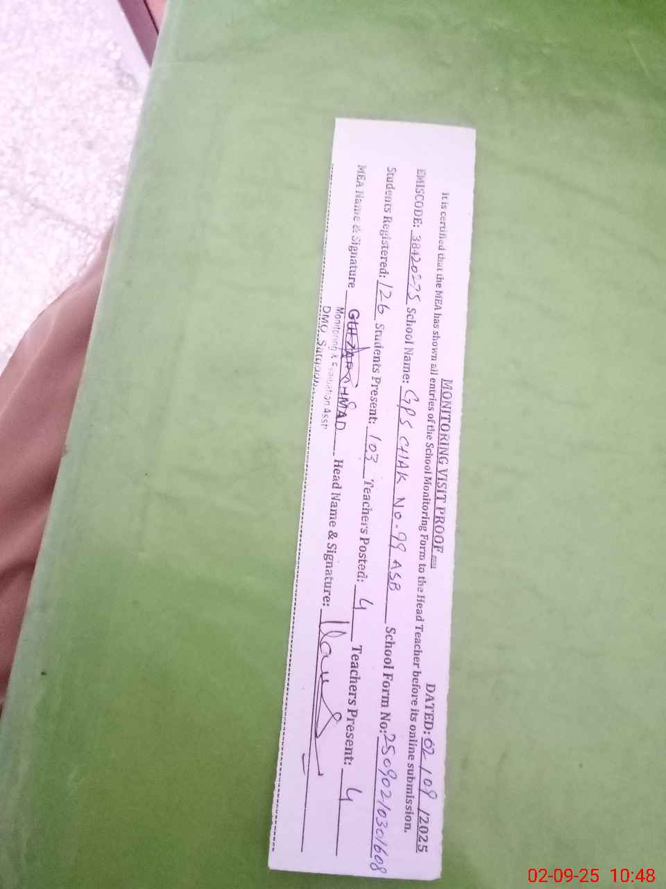 | Attendance Register | Head Teacher | MEA with School | Visit Proof |