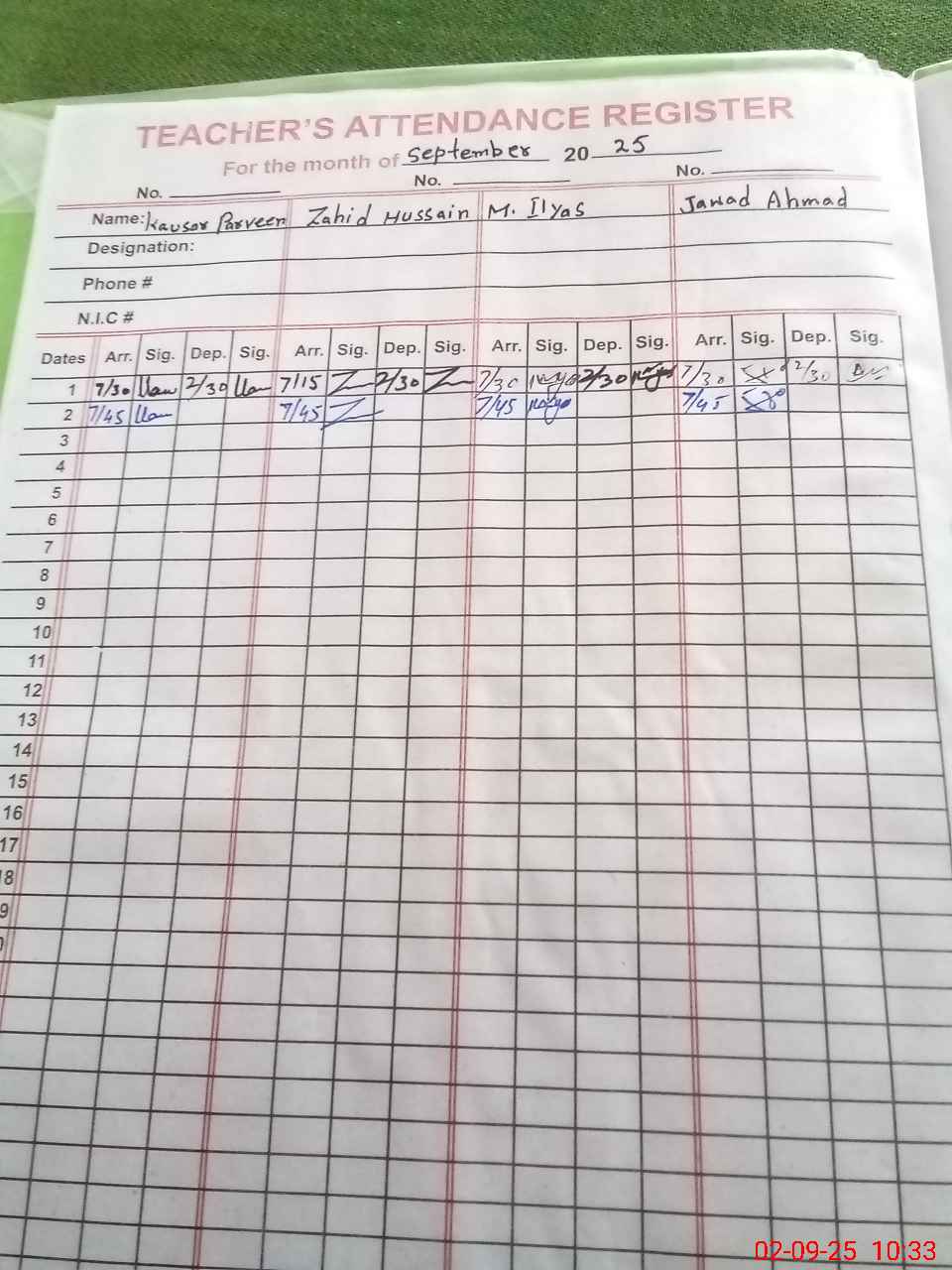 | CNIC | Full Name | Designation | R/C | Absence during last cal. month |