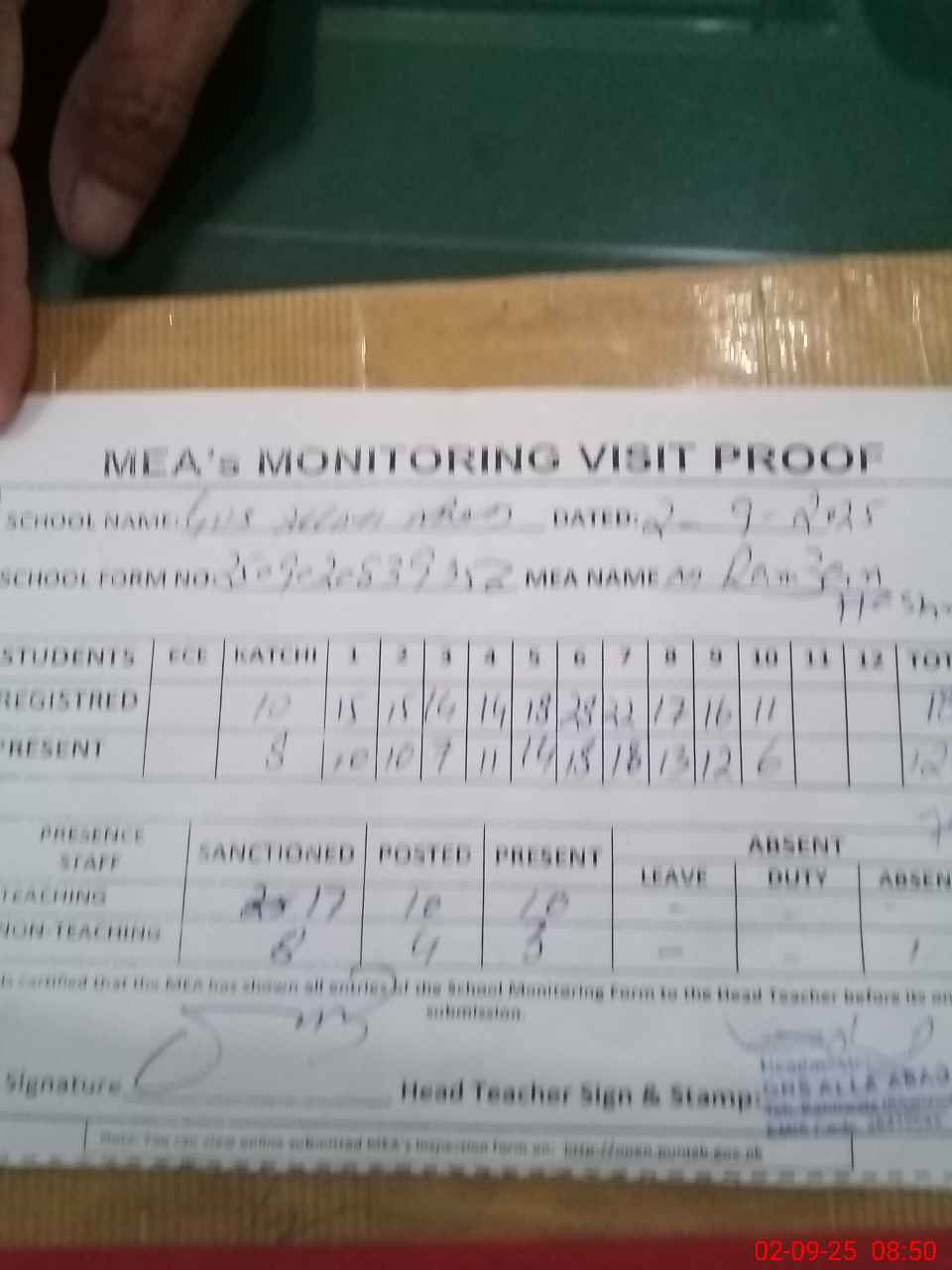 | Attendance Register | Head Teacher | MEA with School | Visit Proof |