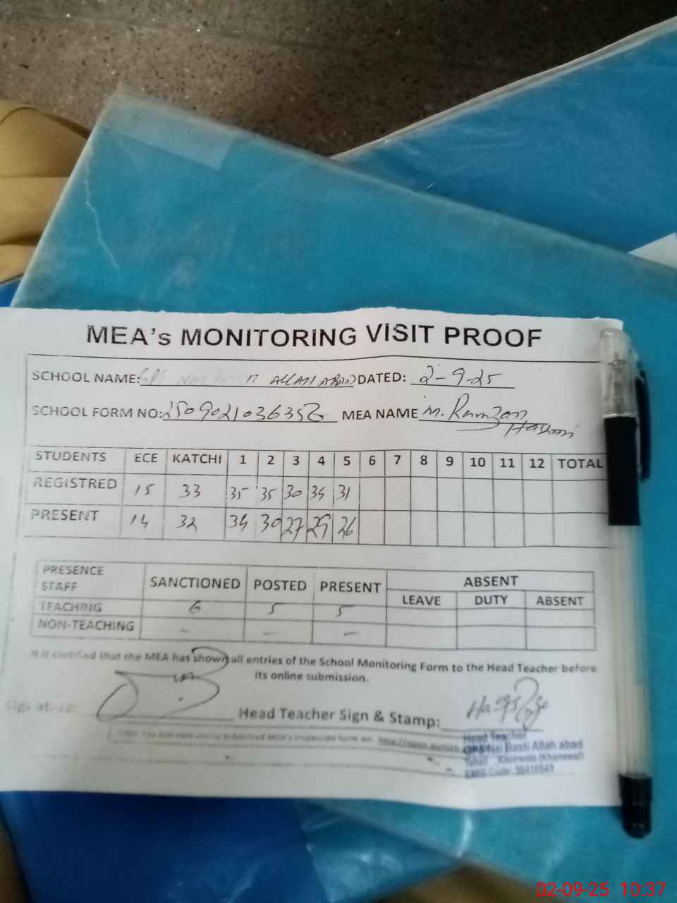 | Attendance Register | Head Teacher | MEA with School | Visit Proof |