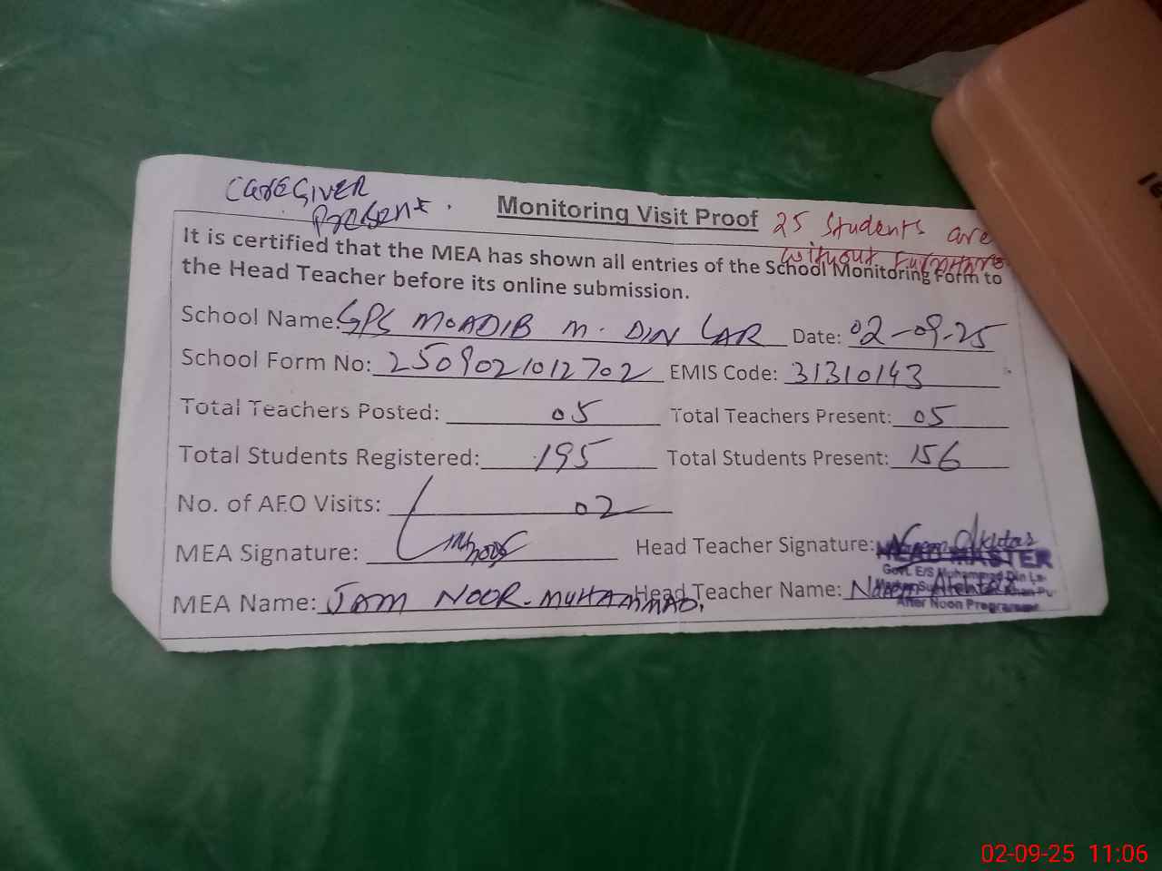 | Attendance Register | Head Teacher | MEA with School | Visit Proof |