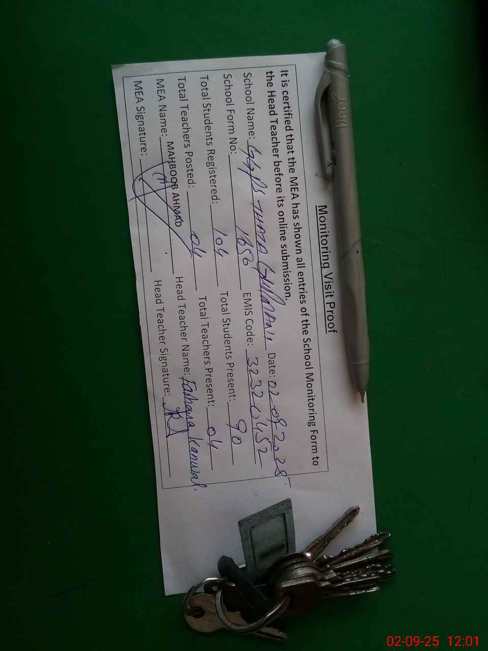 | Attendance Register | Head Teacher | MEA with School | Visit Proof |