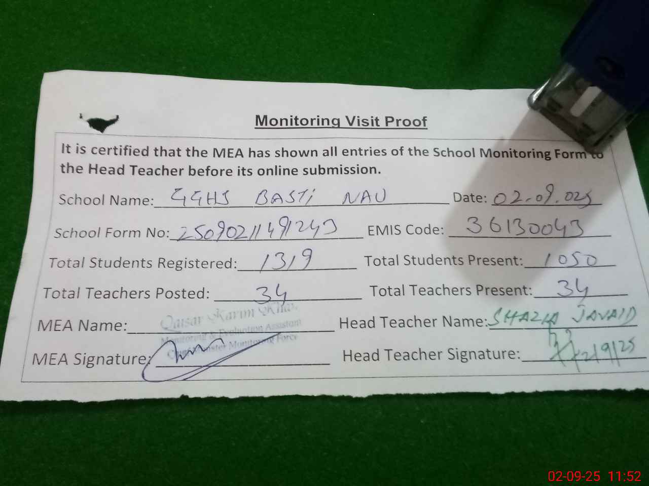 | Attendance Register | Head Teacher | MEA with School | Visit Proof |