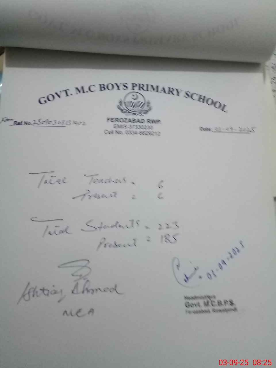 | Name: Me**** Ja**** Designation: (School Headmaster's/Headmistress's) PST Phone/Cell Number: 03**** |